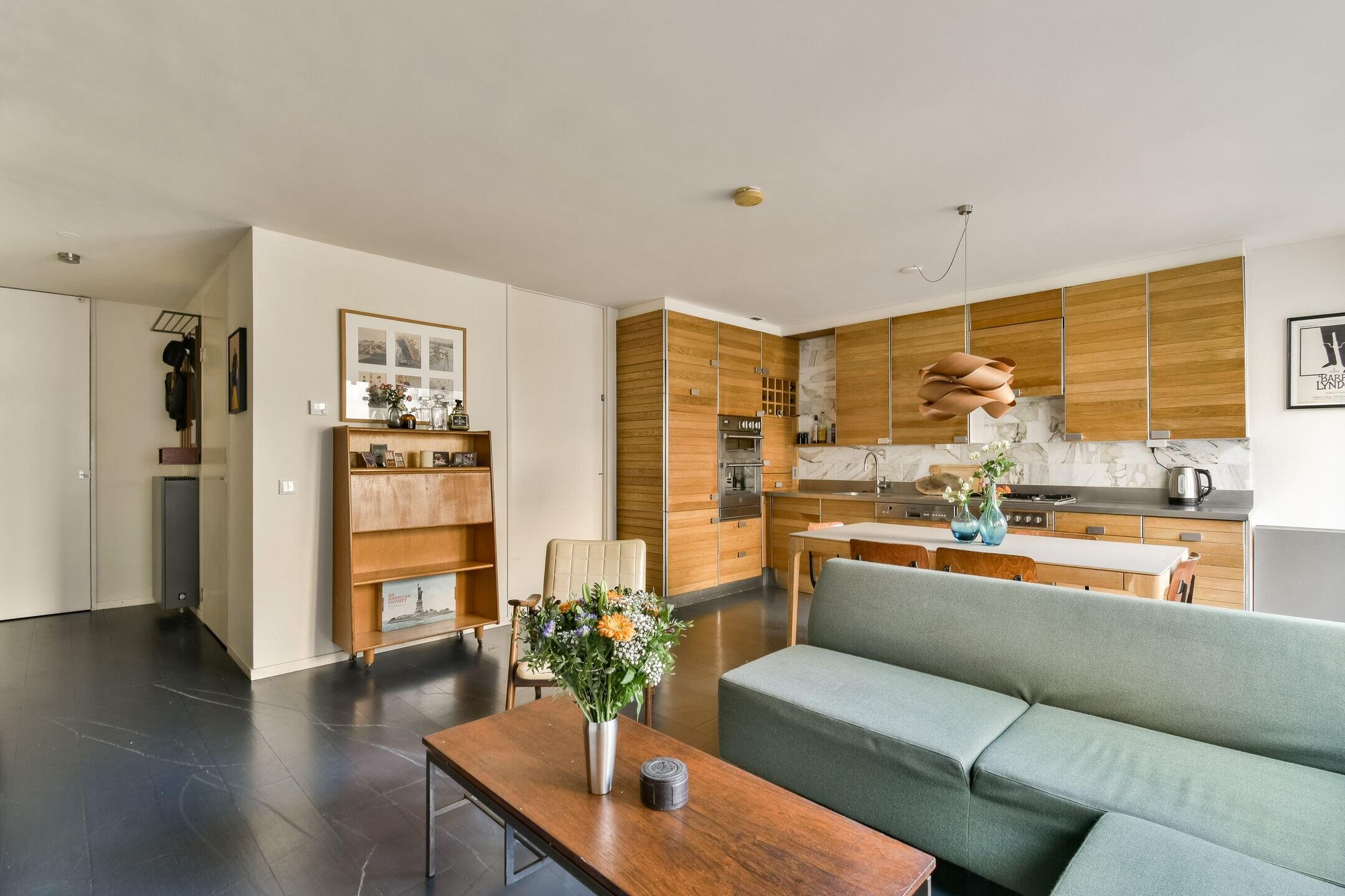 De open keuken is stijlvol en volledig uitgerust met een 4-pits gasfornuis, afzuigkap, vaatwasser, oven, magnetron, koel-vriescombinatie en volop kastruimte. Aan de rustige achterzijde ligt de slaapkamer met inbouwkasten, met aansluitend de badkamer voorzien van wastafel en ruime inloopdouche. De woning is afgewerkt met een houten vloer en beschikt over een eigen inpandige berging op de begane grond.